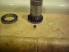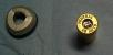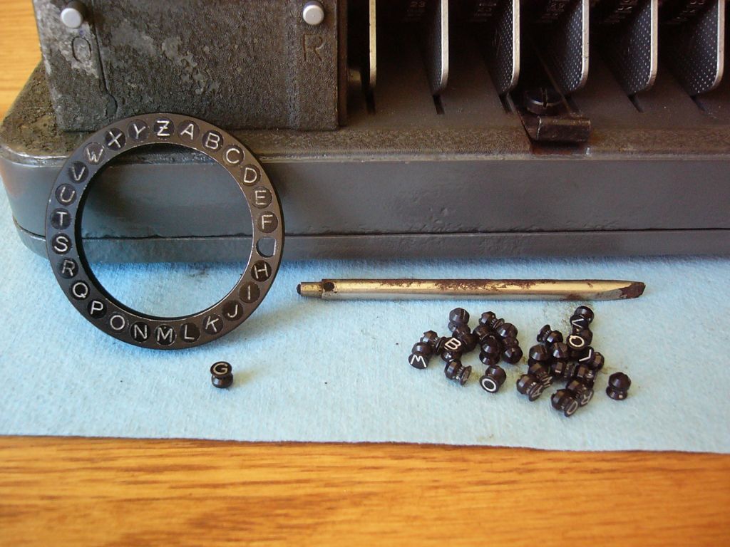 The ball bearing detents were stuck in place in several of the movable type wheel letters. I got a couple of them loose by just soaking them in WD-40 and then shaking the bottle they were in, but several others wouldn’t come out that way. It occurred to me that I may be able to remove them using the same principal as that used in a kinetic bullet puller. After thinking about how to make a suitable tool for this, it dawned on me that I already had what I needed: The primer pocket in an ordinary .45ACP pistol cartridge is just about the right size to hold one of the letters, and the flash hole is large enough to leave the ball detent unsupported. I was able to remove all of the stuck detent balls by taping a letter in place in the primer pocket of an empty cartridge, and then knocking it loose with an ordinary kinetic bullet puller.