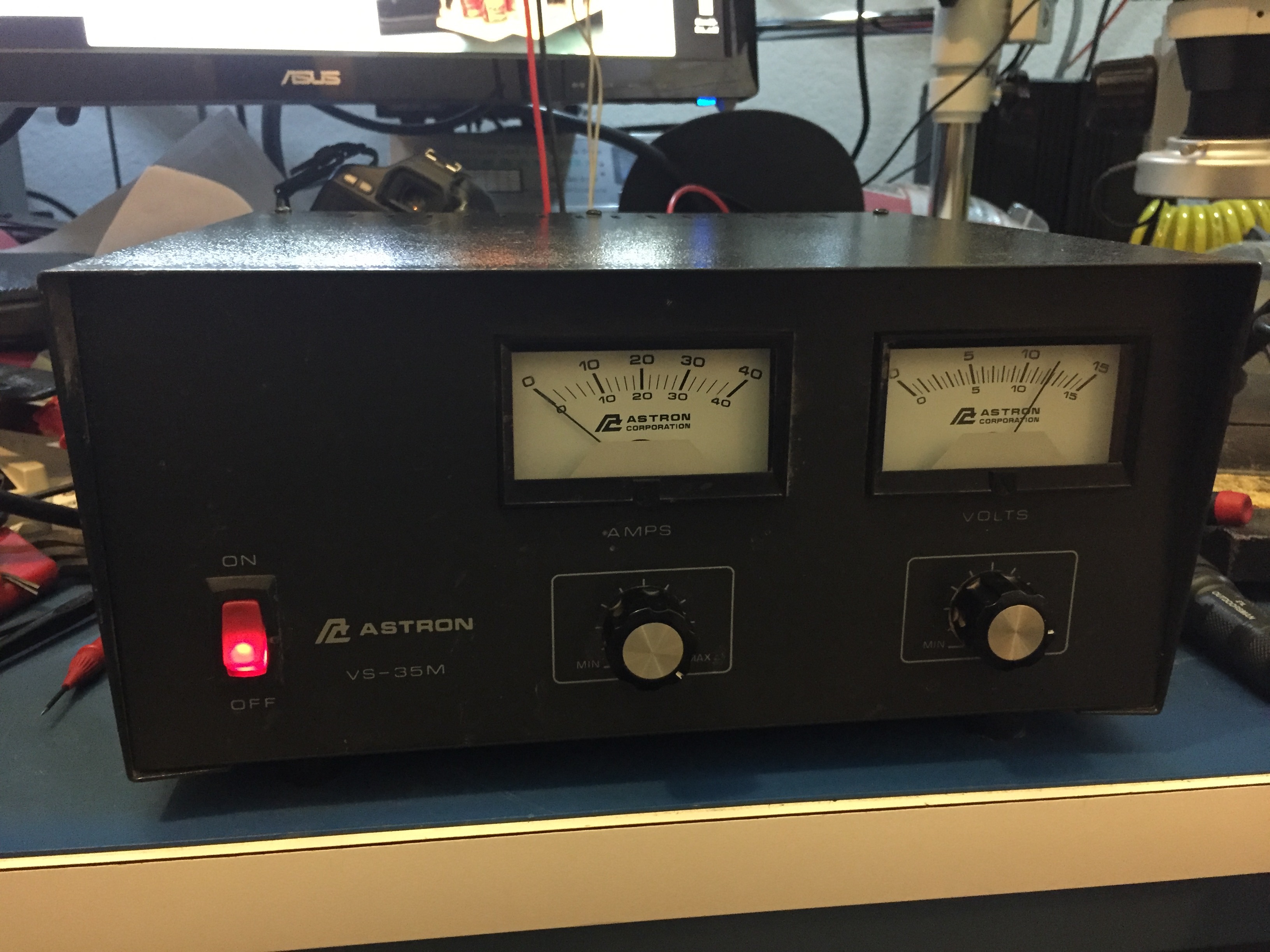 Astron VS-35M This Astron VS-35M supply can provide up to 35A of 12VDC power. It’s a nice, clean (and inefficient) linear supply meant for use with radio equipment. Previous Image Next Image