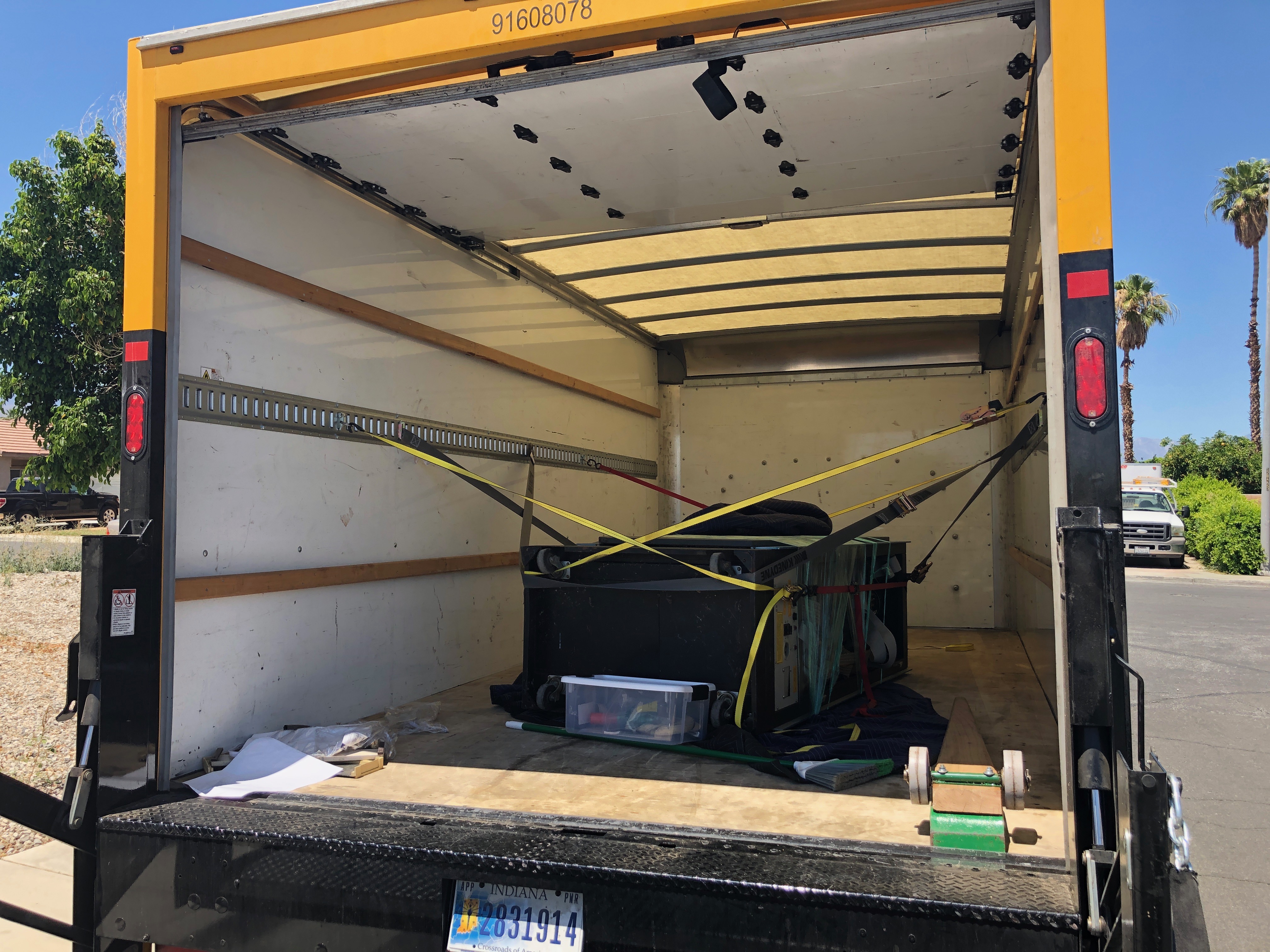 The truck didn’t have any tiedowns at floor level. It just had E-track along the walls at chest height. I had planned to strap the rack vertically against the front or side wall of the box, but we couldn’t do that. Luckily we had just enough straps to figure out some dodgy rigging to keep the rack from sliding in transit… we hoped. By this time, we were really hot and tired.